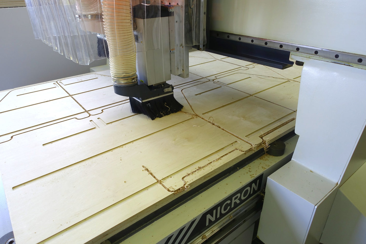 Wij beschikken over twee 3-assige CNC freesmachines. 1 met een werkveld van 320x130cm en 1 met een werkveld van 260x130cm.